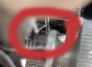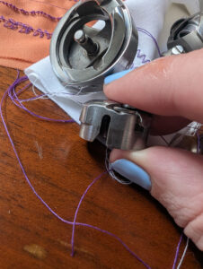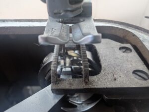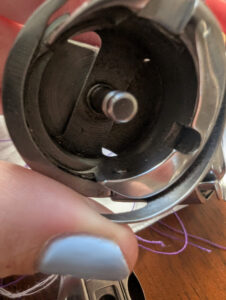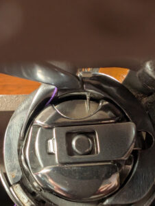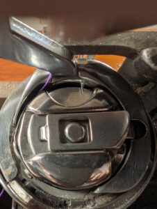 Now, when you put in a 130h needle (the kind you can go into any crafts store and buy a 5 pack of), the needle point extends further down and while there is enough space to pick up the thread on the left side of the ZZ, there is just barely not enough space on the right side of the swing for the thread to move freely – (you have to really look at the reflections of the needle in the bobbin to see how close it is)