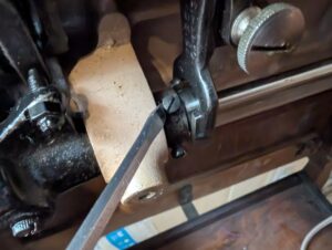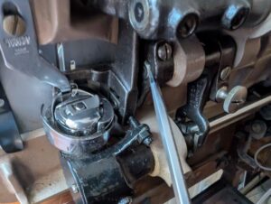 So, to set the timing, lower the needle to bottom dead center where the timing marker hits the first stop, then rotate the handwheel ever so slightly until you hit the second timing mark. Different machines have different timing marks. On the 15-91 the timing mark is on the needle bar below the head, on the 66/185, etc it’s about the halfway point up the needle bar, on the 306k, it’s on the very top.
