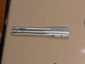 bottom to top: 130h standard universal needle, middle is a dbx1 industrial needle, and top is 206×13 needle – Notice how the eyes are about the same length from the top (right side) of the needle, but the point is shorter from the eye to the tip going up the stack? That causes problems.