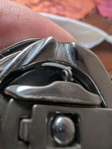 It’s kind of hard to see, but this is what it looks like from the back. The hook is the triangle of metal and the needle is the vertical piece of metal.