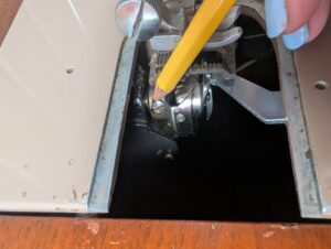 So here’s how it works with a 206 needle: On the left side of the stitch, the needle goes down to the left of the bobbin opening and the thread gets picked up and worked into the stitch. Then it goes up and back down to the right of the bobbin opening and the thread gets picked up and worked into the stitch. (note that this is as close to bottom dead center [BDC] as i can for this). Now there’s not “Plenty” of space for the thread to work its way about the point, but there’s enough.
