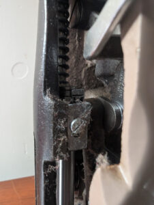 Then tighten the screws, oil everything up, clean the lint off, and give it a test run. The tension is a bit high and it’s pintucking the fabric, but that can be adjusted on another day with a postal balance weight and lots of testing.